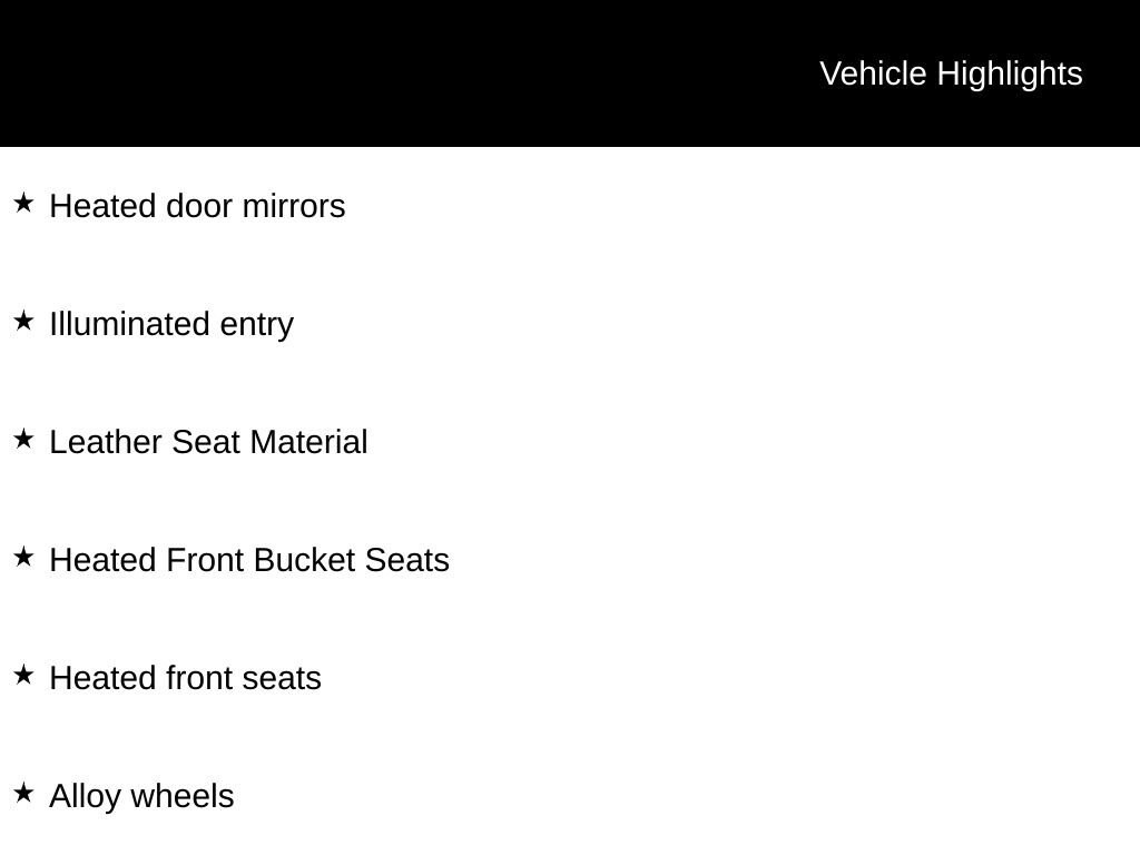 ABS brakes, Active Cruise Control, Alloy wheels, Electronic Stability Control, Front dual zone A/C, Heated door mirrors, Heated Front Bucket Seats, Heated front seats, Illuminated entry, Leather Seat Material, Low tire pressure warning, Power Liftgate, Remote keyless entry, Traction control.
